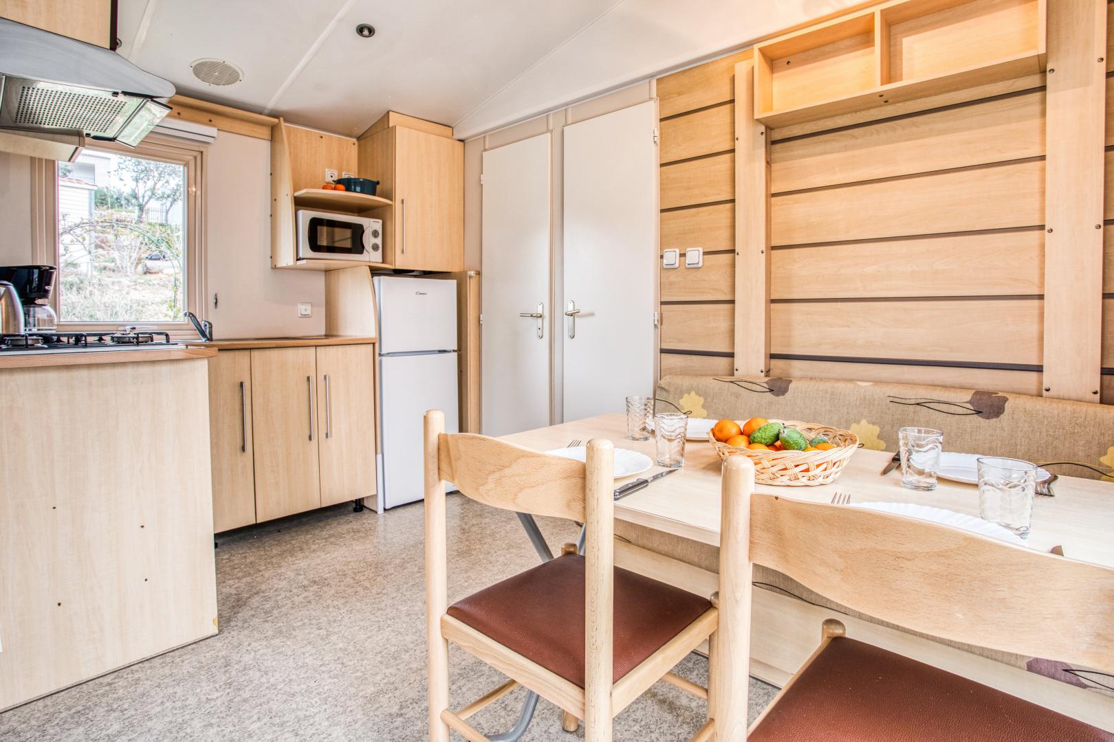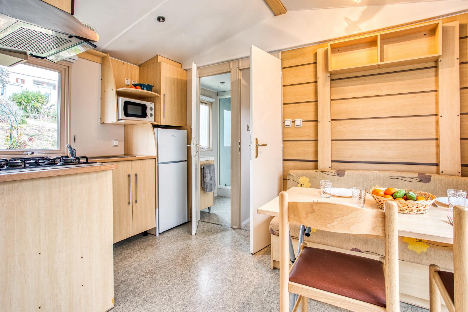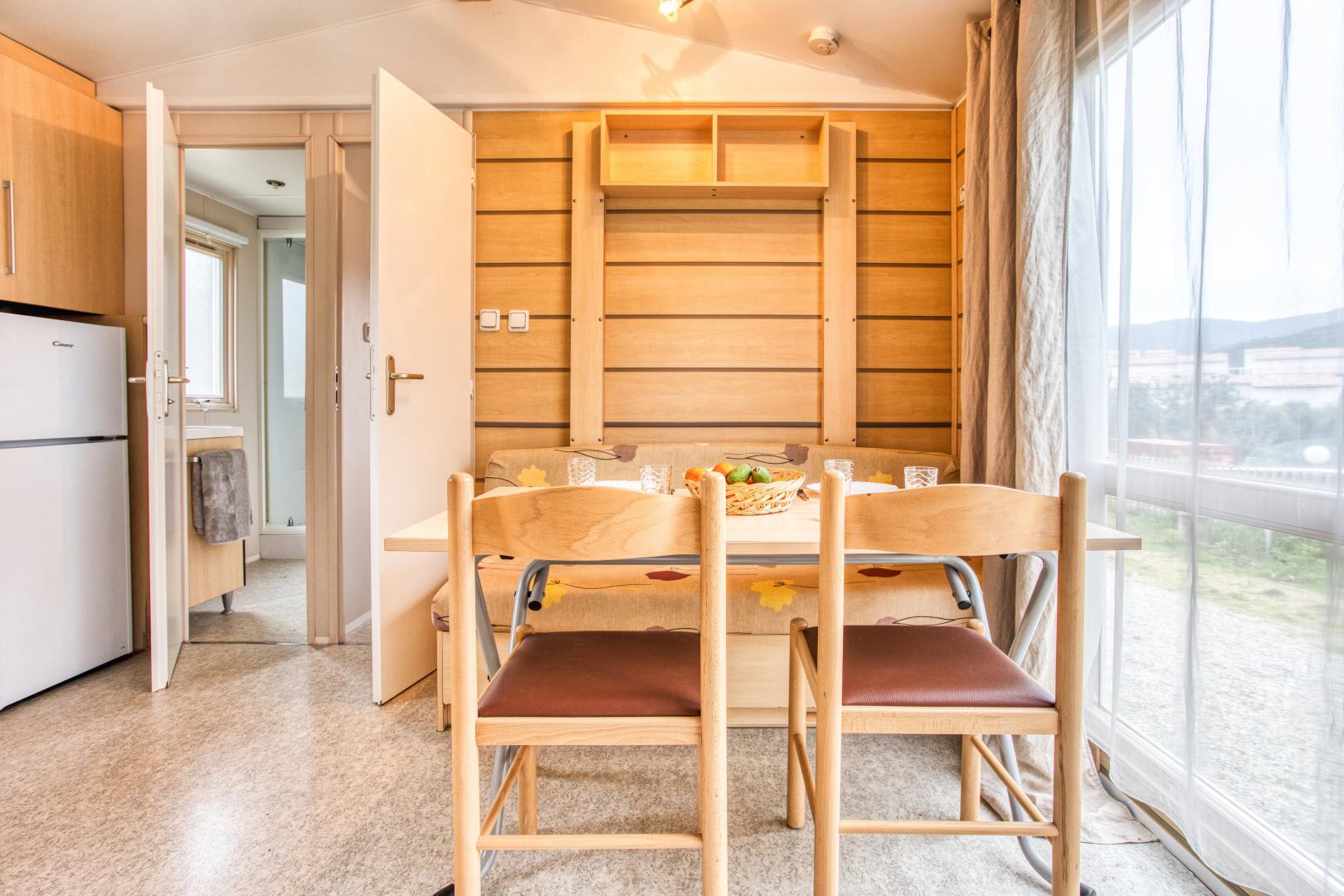 Ce mobil home fonctionnel et bien agencé peut accueillir jusqu’à 5 personnes.